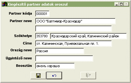 A Partnertörzs adatok kezeléséből lehet elérni az orosz nyelvű partner adatok kezelési képernyőjét. Ezt elindítva a következő ablak jelenik meg: