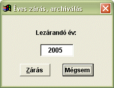 A Zárás gomb lenyomásával a vevő-szállító nyilvántartásból a lezárandó év kiegyenlítetlen számlái és azok tételsorai átkerülnek az új év számlái közé, a törzsadatok (partnertörzs, áruk és szolgáltatások) változatlanul átmásolódnak az új évi adatkönyvtárba. Ez a rendszer főmenüjének Súgó menüjében történő Átlépés funkcióval lesz a zárás után elérhető, az ebbe történő belépés az Indítás, belépés az adatkezelésbe című funkció alatt ismertetett módon történhet meg. ÁFA kulcsok változásakor az új ÁFA kulcsokat az Áruk, szolgáltatások képernyőről elérhető Cikkcsoport adatok táblában kell módosítani.