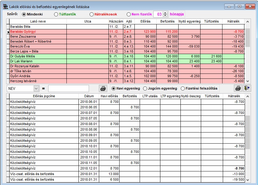 A lakók havi előírásai és lekönyvelt befizetései képezik az alapját az egyenlegek kimutatásának. Erre a célra szolgál ez a menüpont. Indításakor az aktuális rendszerdátum hónapjáig veszi figyelembe az előírásokat és a befizetéseket. Az ablak legfelső részén különböző, az igénynek megfelelő szűréseket lehet beállítani a kimutatások listázására. A felső táblázatban piros háttérrel kiemelt sorok hátralékosokat, zöld háttérrel kiemelt sorok túlfizetőket jeleznek, a nullás egyenlegűek pedig fehér háttérben jelennek meg. A piros betűvel jelzett éppen aktuálisan kiválasztott részére az alsó táblázatban mutatja az előírások és befizetések részletezését jogcím és dátum növekvő sorrendben.