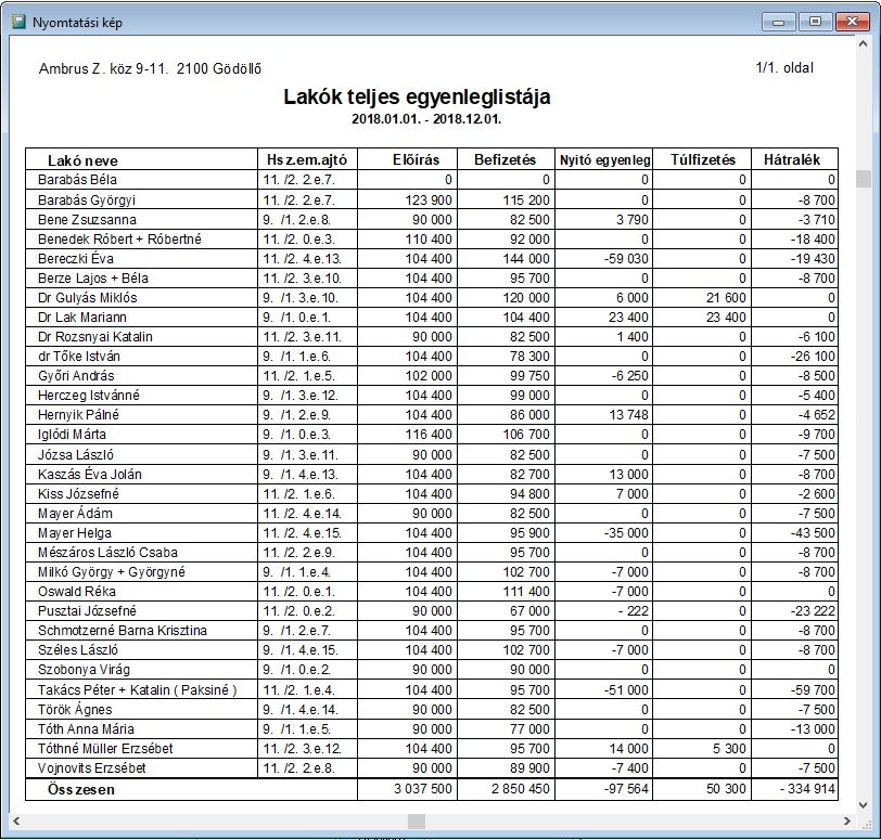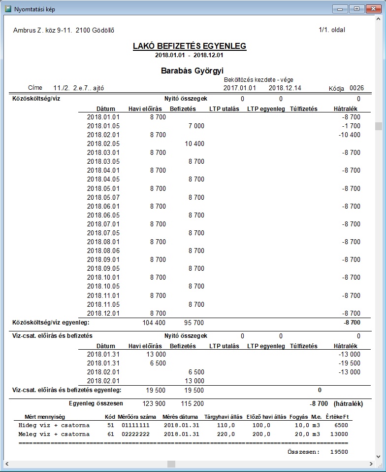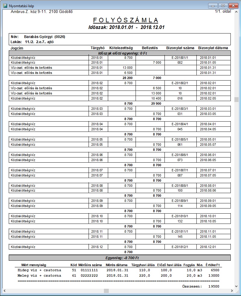 Az ablak közepén lévő nyomtató gombbal lakásonként illetve a lakáshoz kapcsolódó kódonként külön-külön egyenlegkimutatások kérhetők egyedileg illetve egy kéréssel az összes kódra. A folyószámla egyenleg dátum növekvő sorrendben mutatja ki havonta és összesítve az összes előírás egyenlegét. A lista végén az egyenleg kimutatás alatt a mérőórák állásai és az ebből képzett fogyasztások részletezése is kimutatásra kerül.