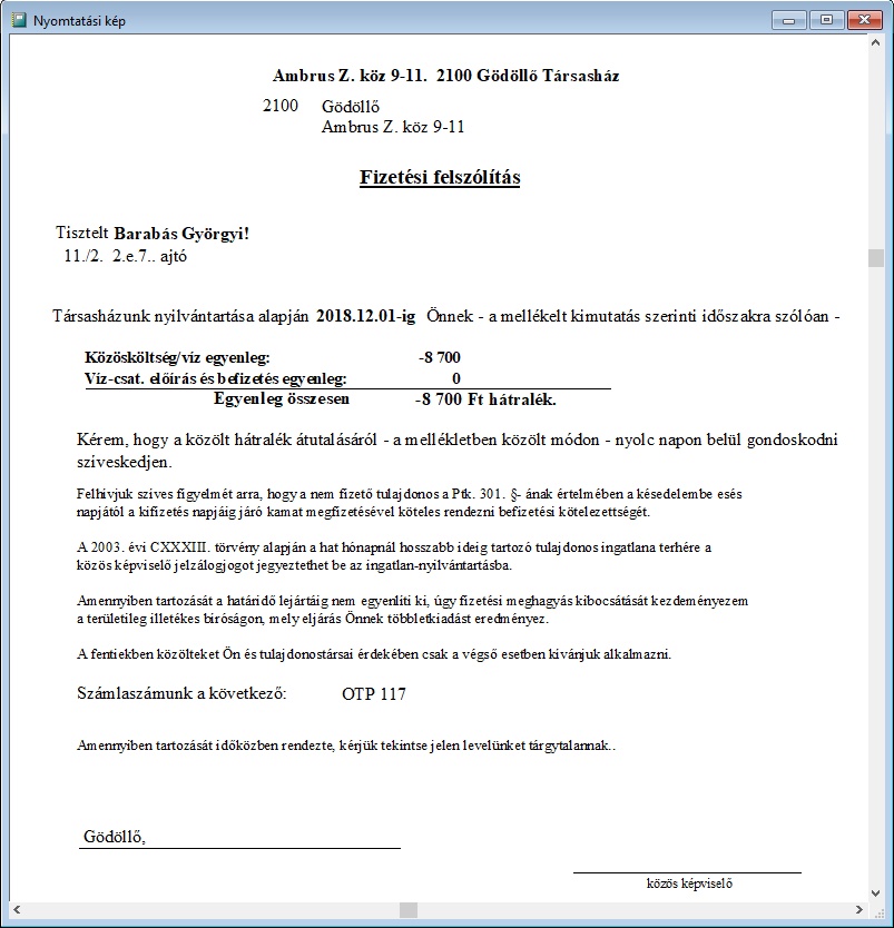 Bármely vagy az összes hátralékosról nyomtatható fizetési felszólítás a hátralék feltüntetésével.