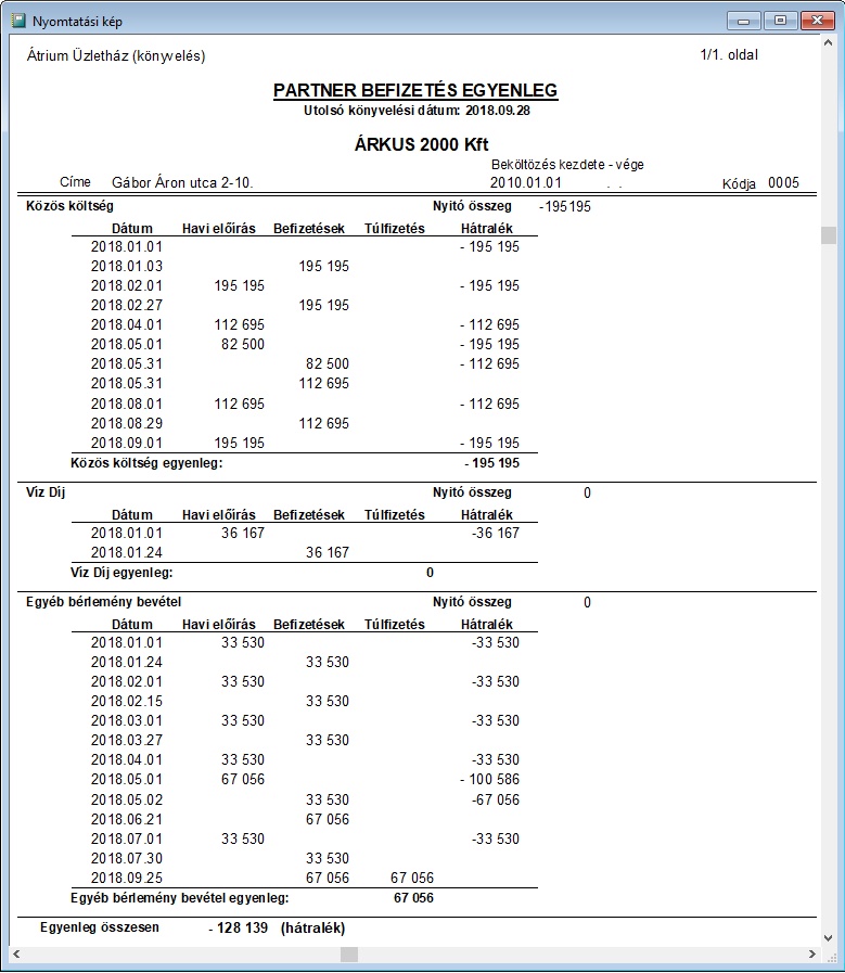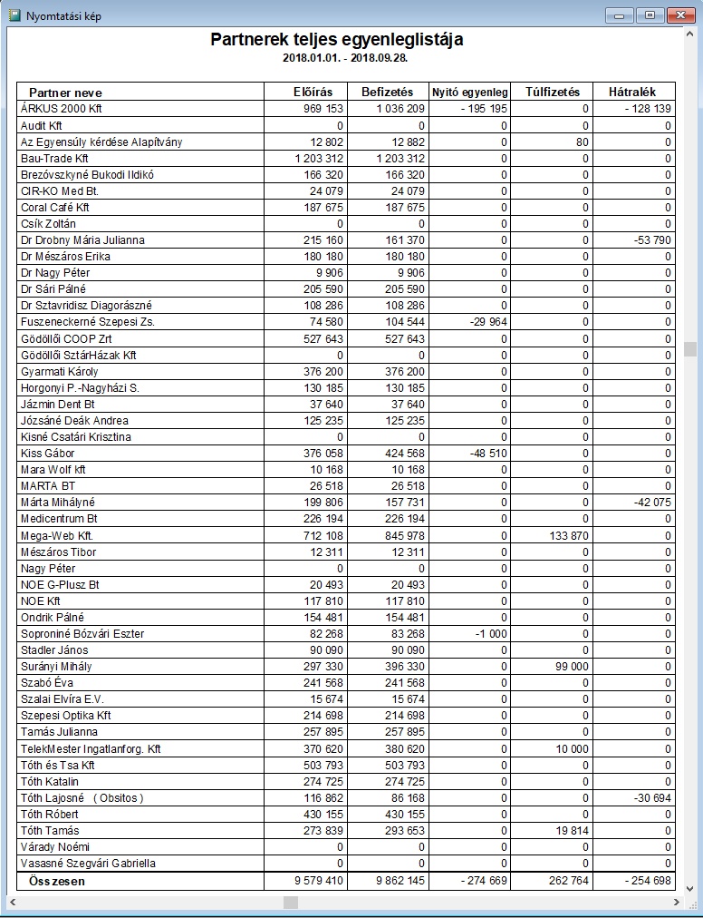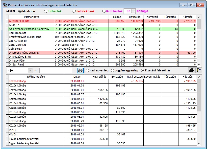 A partnerek havi előírásai és lekönyvelt befizetései képezik az alapját az egyenlegek kimutatásának. Erre a célra szolgál ez a menüpont. Indításakor az aktuális rendszerdátum hónapjáig veszi figyelembe az előírásokat és a befizetéseket. Az ablak legfelső részén különböző, az igénynek megfelelő szűréseket lehet beállítani a kimutatások listázására. A felső táblázatban piros háttérrel kiemelt sorok hátralékosokat, zöld háttérrel kiemelt sorok túlfizetőket jeleznek, a nullás egyenlegűek pedig fehér háttérben jelennek meg. A piros betűvel jelzett éppen aktuálisan kiválasztott részére az alsó táblázatban mutatja az előírások és befizetések részletezését jogcím és dátum növekvő sorrendben.