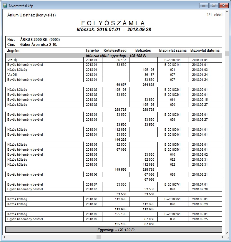 Az ablak közepén lévő nyomtató gombbal albetét kódonként külön-külön egyenlegkimutatások kérhetők egyedileg illetve egy kéréssel az összes kódra. A folyószámla egyenleg dátum növekvő sorrendben mutatja ki havonta és összesítve az összes előírás egyenlegét.