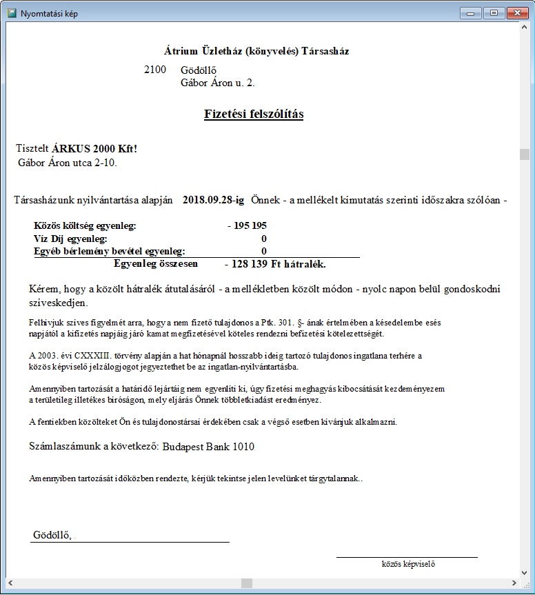 Bármely vagy az összes hátralékos partnerről nyomtatható fizetési felszólítás a hátralék feltüntetésével: