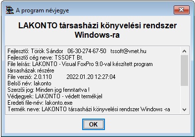 A Szervíz menü Névjegy menüpontjából megjelenő ablak az alkalmazásról jelenít meg információkat, negyedik sorában verziószáma és elkészítésének ideje látható. A programmal kapcsolatos észrevételeket a fejlesztő e-mail címére vagy telefonszámára lehet megtenni.