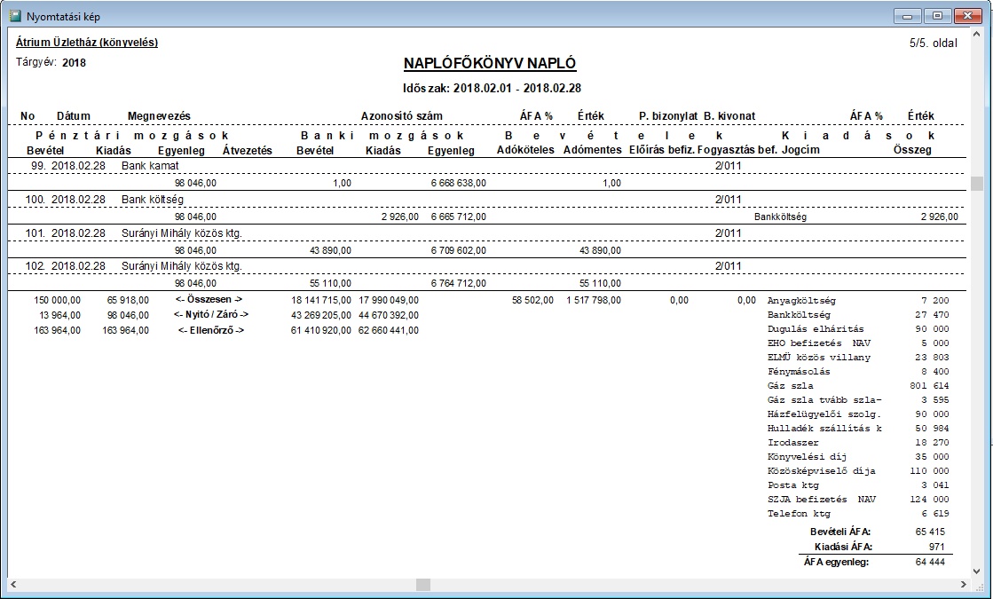 Naplófőkönyv listázható dátumszűrővel vagy anélkül az összes könyvelt tételről: